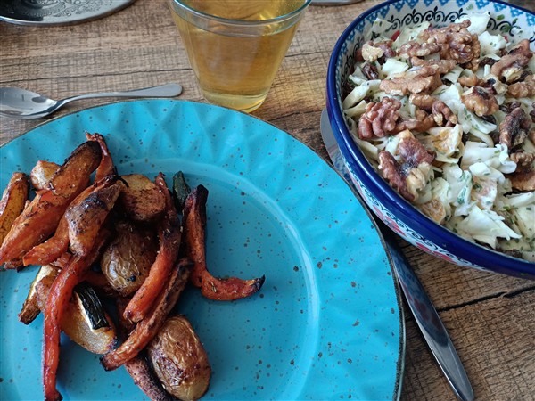 Kwart over zes. Koffie. Allerlei. Begin van de ochtend loop ik de gebruikelijke zaterdagmorgenronde langs slager en super. Koffie met De Vrouw op de galerij in de zon. Vandaag is het warm en benauwd. Dan nogmaals het centrum in voor een bezoek aan een andere super. Thuis wat voorbereidingen voor de vakantie. Meer koffie met De Vrouw op het balkon in de zon. Lunch. Afwasje, stofzuigen en huishoudelijks. Ik fiets naar Onze Vader, breng de laatste schone was, ondersteun bij wat zorgelijke dingen (een nieuwe telefoon, onder andere) en dan weet hij dat hij het even drie weken zonder me moet doen (ook De Zus is net op vakantie). Thuis allerlei. Eind van de middag maak ik avondeten. Ik leg aardappel en zoete bataat in een braadslede en die schuif ik de oven in. Later gaat er kastanjechampignon bij. Voorts monteer ik een salade van spitskool, mandarijn en sultana. Voor De Vrouw bak ik steak bavette. We eten de groenten allemaal op; het restant salade is voor maandagavond. Afwasje. Krant op het balkon. Webstek. Lezen op het balkon.