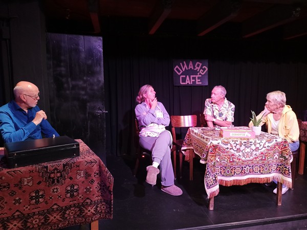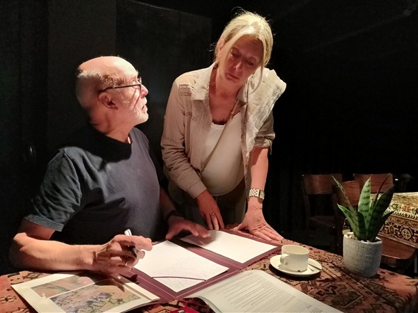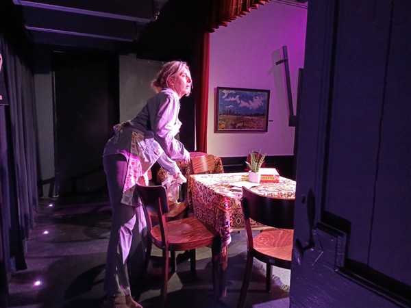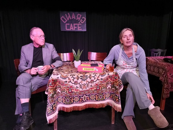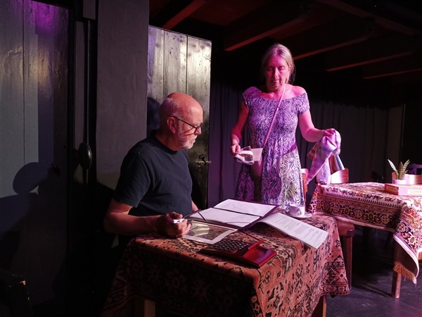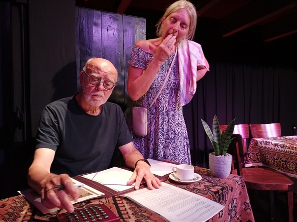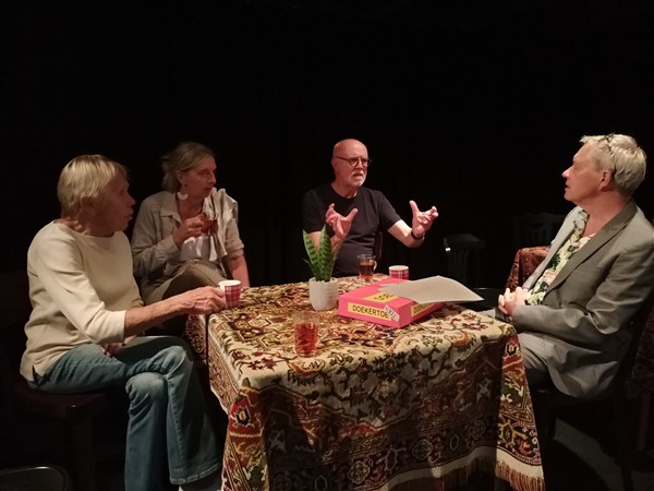 Zondag 29 juni: nog éénmaal Doekertoe, een toneelspel voor wie er nog toe wil doen in de theaterzaal van landgoed Kleine Noordijk in Wilp Half zes. Ik loop een ronde hard langs het kanaal. Het is al snel warm en benauwd. Thuis nog terug in bed. Kwart over acht staan we op. Koffie. Laatste voorbereidingen voor vanmiddag. Lezen. Kwart voor elf fiets ik naar Peter-Jan. Getweeën rijden we naar Wilp. Daar komen zojuist ook Ingrid en Bertus aan. We zetten spullen klaar en lunchen op het terras van het landgoed. Tegen twee uur trekken we ons terug achter de schermen en om drie uur begint het stuk Doekertoe, een toneelspel voor wie er nog toe wil doen. Het spel gaat soepel en vloeiend, ik ben uiterst geconcentreerd zit er mooi in. We zijn uitverkocht, de zaal zit propvol en na afloop krijgen we veel goede reacties. Op het terras nemen we alle complimenten in ontvangst. Er volgt nog een nazit, dan ruimen we alle spullen op en pakken we de auto’s in en om half acht ben ik thuis. De Vrouw serveert het restant gevulde tomaat van gisterenavond, aangevuld met een tomatensaus met peulen en andere groenten. Ook maken we het laatste beetje salade van vrijdag op. Afwasje. Webstek. Lezen op het balkon. Muziek vandaag: Zombie Apocalypse (Adam Holzman)