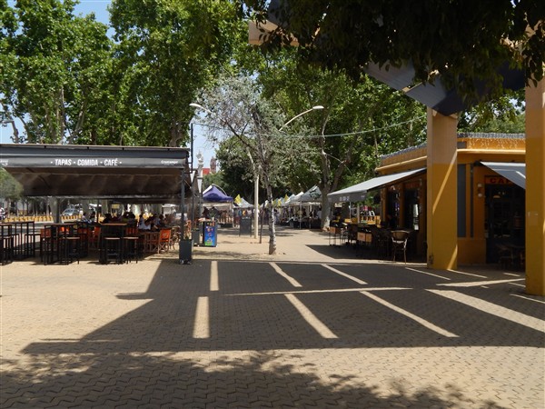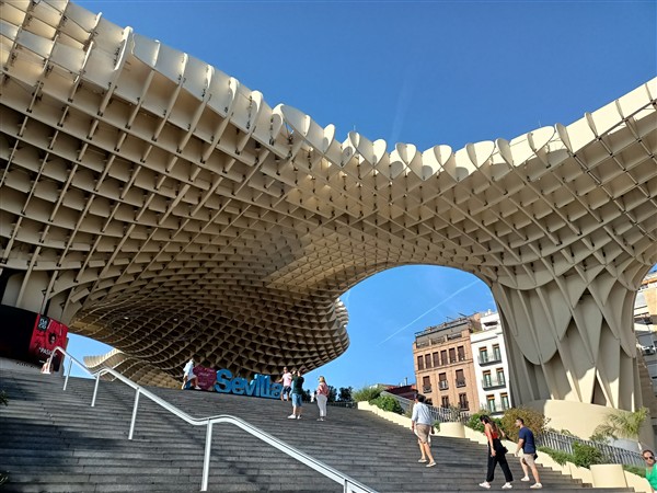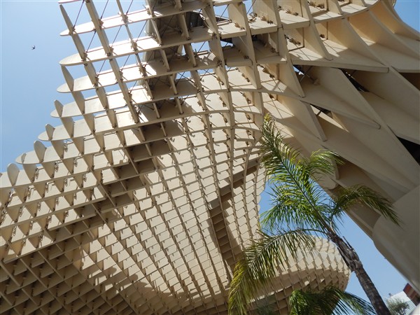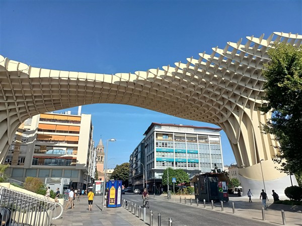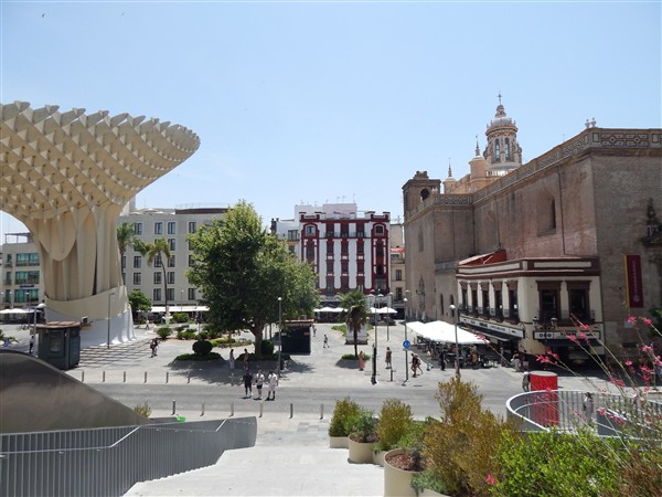 Zaterdag 14 juni: Sevilla Acht uur op. Koffie. Dan loop ik naar de bakker. Ontbijt. Half elf gaan we op pad. Vandaag houden we beter rekening met de hitte (36°C). We pakken bus C4 naar de oude stadsmuren (Murallas) en gaan de wijk La Macarena bekijken. Eerst de Basílico de Macarena. Er heeft zojuist een huwelijksinzegening plaatsgevonden, dus kunnen we het beroemde beeld niet van heel dichtbij bekijken. Maar van achter uit de kerk zien we veel. Dan slenteren we door smalle straatjes naar het plein Aladenda de Hércules. Er is (toevallig) een biologische markt gaande. We kopen queso en op een terras drinken we thee. Dan wandelen we verder de Calle Amor de Dios in. Platenwinkels. We lunchen vlakbij de Metropol Parasol: yoghurt met fruit, crêpe met geitenkaas, groenten, guacamole en hummus en smoothies ananas met mango. Vervolgens willen we bovenop de Metropol Parasol kijken, maar de toegangsprijs is te hoog: we verwachten dat we in de hitte niet langer dan een kwartier bovenop blijven. Dus bekijken we het markante bouwwerk van onderaf en daarna pakken we bus 27 terug. Iets voor vier uur zijn we weer in het appartement. Rusten. Half acht lopen we een klein eindje naar een Indiaas restaurant in de wijk. We eten onion bajii, groentesamosa, kip en paneer in currysaus met arroz pilau en peshwari naan. Thee toe. Zeer smakelijk allemaal. Op de terugweg wandelen we langs een ijszaak. Tien uur zijn we terug in het appartement. 36°C, zeer zonnig.