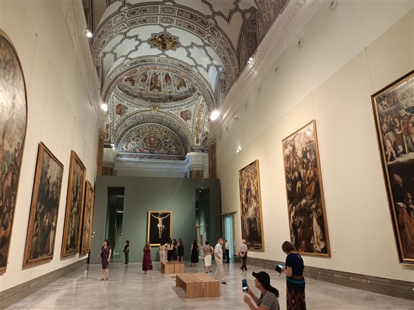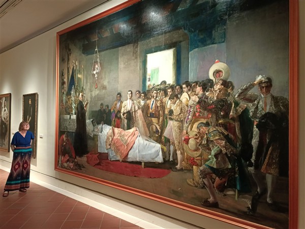 Zondag 15 juni: Sevilla Kwart voor acht op. Avonturen. Bij het indoen van mijn linkerhoortoestel knapt de kabel tussen toestel en luidspreker. De luidspreker zit in mijn oor en we krijgen hem er niet uit. Er zijn audiciens in de buurt, ook die het merk toestel dat ik draag in het assortiment hebben. Het is zondag. Morgenochtend negen uur dus proberen. Koffie. De bakker is dicht, dus ontbijten we met brood uit de vriezer en met de kaas die we gisteren hebben gekocht. Wat na tien uur gaan we op pad. Het is warm, maar nu nog te doen. We pakken bus vijf naar de Puerte de Jerez. Daar stappen we uit. We wandelen een stukje langs de Guadalquivir en zien de Torre del Oro en de Plaza de Torro. Vanaf de volgende brug hebben we een mooi uitzicht op de wijk Triana aan de overkant. Dan is het niet ver naar de Iglesia de la Magdalena en die bekijken we snel van binnen, voor de zondagsdienst begint. Het Museo de Bellas Artes ligt iets verderop. Ervóór is een kleine kunstmarkt gaande en die pikken we even mee. Vervolgens het Museo in. Veel werken van oude Spaanse meesters (Murillo!), maar het gebouw zelf is ook fraai; het museum is gevestigd in een voormalig klooster. Kwart over twee hebben we het meeste gezien en wandelen we naar eethuis Filo (zie eergisteren). Daar eten we salade en pita en nuttigen we bietensmoothies. Langzaam (want zeer warm (34°C) lopen we de wijk Santa Cruz uit. We pakken bus 5 weer en rijden een halte mee. Iets na vieren zijn we terug in het appartement om uit te rusten. Half acht weer de straat op. We lopen een klein stukje naar een Italiaans restaurant vlakbij. Alles is gereserveerd, maar als we vóór tien uur weg zijn, is er nog een tafel. Dat lukt. We eten pizza en cheesecake en dan hebben we nog tijd over ook. Om tien uur zijn we terug in het appartement en is het buiten nog steeds erg warm (33°C).