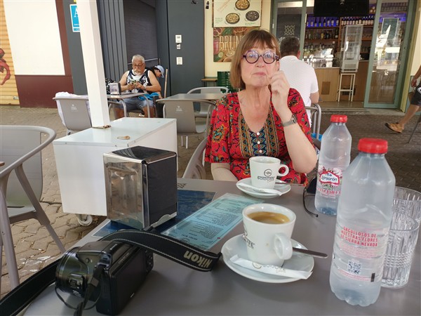 Maandag 9 juni: Málaga Pas kwart voor acht wakker. Koffie. Dan haal ik brood bij een panaderia, op een paar honderd meter lopen, wel een paar trappen op. We ontbijten met brood, queso, chorizo en koffie. Halverwege de ochtend wandelen we naar het Alcazaba, een bijna duizend jaar oud fort op een berghelling aan de rand van het centrum. Ervoor ligt een Romeins amfitheater. We kopen kaarten voor een bezoek aan het Alcazaba en aan het daarachter en nog heel veel hoger gelegen Castillo de Gibralfaro. Het fort is gaaf, wel heel veel klimmen en afdalen. Voortdurend poorten, hofjes, torens en fraaie uitzichten. Niet goed voor mijn hoogtevrees. Als we bovenin het fort zijn, realiseren we ons dat we niet verder omhoog kunnen; willen we het Castillo de Gibralfaro bezoeken, dan moeten we helemaal naar beneden en vervolgens via een kronkelweg de heuvel weer op en nog heel veel hoger. Dat laten we even zitten. In plaats daarvan lopen we naar het nabijgelegen museum voor moderne kunst Centre Pompidou. Het ligt aan de jachthaven, waar we gisteren ook waren. Het museo blijkt gesloten vanwege een wisseling van de collectie. Dus wandelen we langs de haven terug naar het centro en onder de Catedral drinken we iets bij een pub en eten we ijs bij een tentje ernaast. Dan de Catedral in. Indrukwekkend. Na vijven zijn we terug in het appartement en rusten we uit. Acht uur naar het Plaza de Merced. Daar zagen we vanmiddag een aardig tapasrestaurant Picasso. We krijgen een plekje op het terras aan het plein. Croquettes, patatas, geitenkaas en gefrituurde aubergine, met verschillende dips. Smakelijk. Al snel blijkt het restaurant gewild: er staan veel mensen te wachten en dan is de bediening en afhandeling zeer vlot. Voor we het weten moeten we plaats maken. We maken een wandeling naar de westkant van het centrum tot aan de rivier en zien de Mercado en een paar plekken waar we nog eens terug kunnen. Op de terugweg ergens ijs. Na tien uur terug in het appartement. 25°C bewolkt en zonnig.