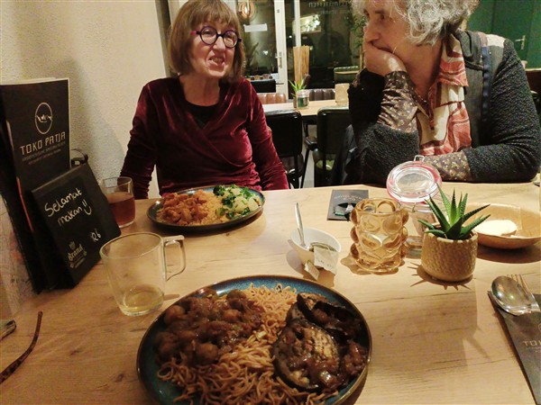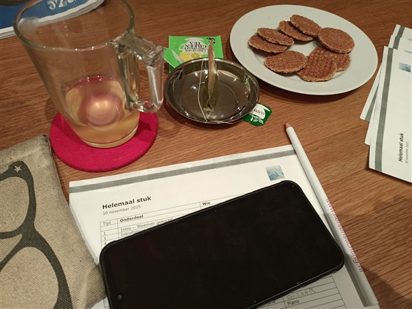 De wekker gaat om zes uur, maar ik hoor hem pas om tien over. Half acht ontbijt, net zo uitgebreid. We nemen wat mee voor onderweg. Kwart voor negen trein naar Eindhoven. De overstappen gaan voorspoedig en om kwart over twaalf staan we op het station in Apeldoorn. Thuis omkleden en gelijk door naar Gigant. Ik heb de generale van gisteren gemist en hoop op de mogelijkheid van korte doorloop. Meer tekst volgt. Half zeven ben ik thuis. We wandelen naar het Italiaanse restaurant iets verderop in de straat. De zaak is gesloten wegens drukte, maar men rekent op ons. We eten een mooie en zeer smakelijke pizza (mandorle). Kwart over acht zijn we thuis. Even op adem komen en rond half tien ga ik slapen.