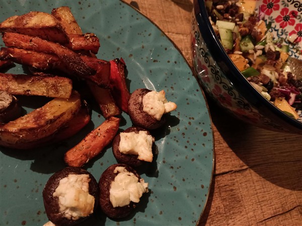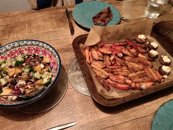 Zaterdag 24 januari: Half zeven. Koffie, ontbijt, allerlei. Krant. Begin van de ochtend loop ik de gebruikelijke zaterdagmorgenronde langs slager en super. Erna nogmaals het centrum in voor een bezoek aan een andere super en de Syrische winkel. Meer koffie met De Vrouw. Meer koffie. Lunch. Afwasje en huishoudelijks. Vervolgens fiets ik naar Ugchelen en bezoek Onze Vader. Ik wissel de was, we nemen de menukaart voor de komende week door en dan komt er een verpleger aan tafel zitten om het artsenoverleg van maandag voor te bereiden. Zoals het ernaar uitziet kan Vader over twee weken naar huis, onder voorwaarde dat hij kan traplopen. Een soort proefverlof zou helpend kunnen zijn. Als de verpleger weg is en we hebben het er samen over, blijken er nog een boel twijfels en vragen te zijn. Vier uur ben ik thuis en niet lang daarna ga ik avondeten maken. Ik leg aardappel, bataat, pompoen en paprika in een braadslede in de oven. Dan maak ik een salade van bosui, koolrabi, rode kool, komkommer en kaki. Voor De Vrouw bak ik steak bavette. We eten alles op. Natafelen. Afwasje. Lezen. Webstek. Verder lezen. Muziek vandaag: Under Heavy Manners / God Save The Queen (Robert Fripp), Lumen (Bill Laurance), Symphonic Live (Yes)
