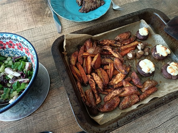 Half zeven. Koffie, ontbijt, allerlei. Begin van de ochtend loop ik de gebruikelijke zaterdagmorgenronde langs slager en super. Erna opnieuw het centrum in voor een bezoek aan een andere super en de Syrische winkel. Koffie met De Vrouw. Meer koffie met De Vrouw. Lunch. Afwasje en huishoudelijks. Dan fiets ik naar de herstelafdeling en bezoek Onze Vader. Hij is verward, was kort ervoor onwel geworden, maar herinnert zich er niets van. Sowieso weet hij weinig tot niets meer en daar maakt hij zich zelf ook zorgen om. Ik wissel was en weet toch een aardig gesprek met hem te voeren, ook al haalt hij van alles door elkaar en vertelt hij mij een verhaal dat ik nog geen minuut ervoor juist aan hém heb verteld. Na een half uur merk ik dat hij moe is en fiets ik terug. Thuis maak ik avondeten. Ik leg aardappel en bataat in een braadslede in de oven. Een klein restant salade van gisteren vul ik aan met kaki. Ik vul een portobello met feta en leg die bij de groenten in de oven. Voor De Vrouw bak ik steak bavette. We eten alles op. Natafelen. Afwasje. Lezen. Webstek. Lezen en toneeltekst.