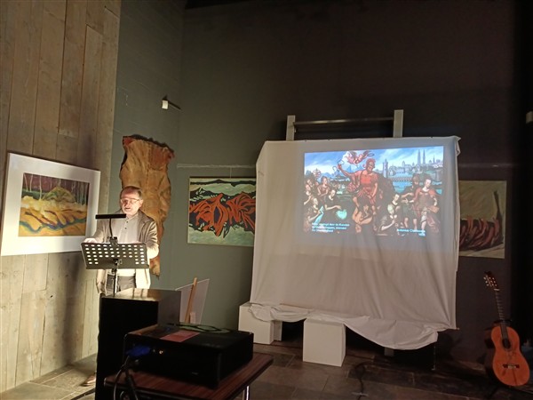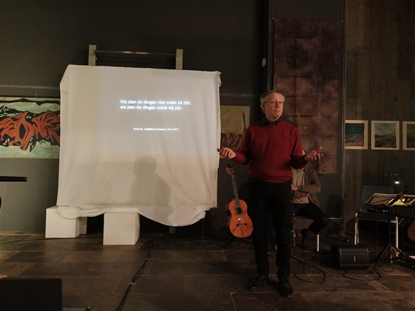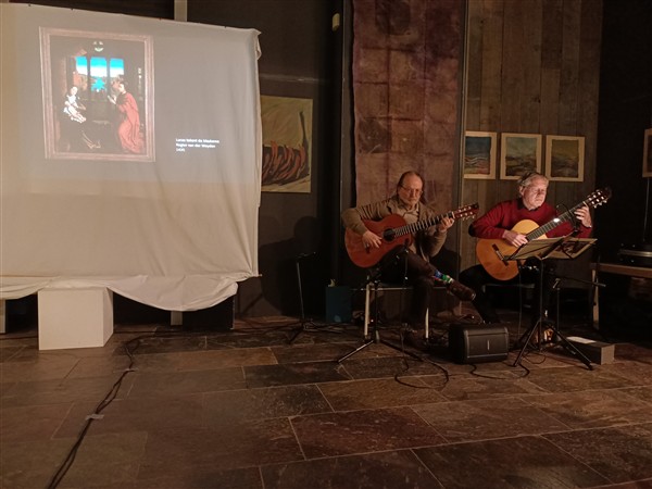 Donderdag 19 februari: Onrustig geslapen. Uit balans? Op tijd op de werkplek, ondanks sneeuw. Veel werk. Tussen de middag wandel ik door bos. Werk. Kwart over vijf thuis. De Vrouw serveert de restanten van de ovenschotels van maandag- en dinsdagavond met een restant salade van gisteren ernaast. We eten alles op. Afwasje. Krant. Half zeven lopen we naar de Galerie Ateliers Apeldoorn in de Oranjerie. Peter-Jan en Aad doen daar nog een keer hun presentatie van onzijnen bij schilderijen uit het Groeningemuseum en van hun bewerkingen van Beatlessongs voor akoestische gitaar. Hoewel ik alles al wel eerder heb gezien en gehoord, is het toch genoeglijk om weer mee te maken. Nogal wat bekenden in het weinige publiek. Even na negen zijn we weer thuis. Even lezen, dan slapen. Muziek vandaag: geen