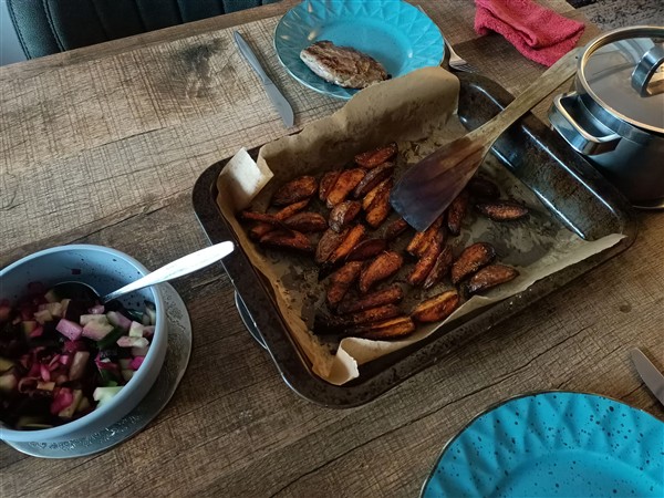 Zaterdag 21 maart: Lente. Kwart over zes op. Koffie, ontbijt, allerlei. Begin van de ochtend loop ik naar de slager en markt. Koffie met De Vrouw. Ik fiets naar de Syrische winkel en daarna door naar Onze Vader. Hij is rustig en opgewekt, heeft gisteren nog twee woonlocaties bekeken en die vindt hij beide prima. Een ervan is hier niet ver vandaan, dat scheelt reistijd voor zowel De Zus als mijzelf, dus dat zou ideaal zijn. Ik wissel was, we drinken koffie en kletsen nog wat. Thuis koffie met De Vrouw. Later lunch. Afwasje en huishoudelijks. Ik wandel een rondje buiten het centrum. Lezen. Eind van de middag maak ik avondeten. Ik leg aardappel en zoete bataat in een braadslede en die gaat de oven in. Een restant witlofbietensalade vul ik aan met komkommer en ik warm een restant dhal op. Voor De Vrouw bak ik steak bavette. We eten alles op. Natafelen. Afwasje. Lezen. Webstek. Er zijn foto’s van Ernst van zondagmiddag. Lezen. Muziek vandaag: At The End Of Time – Churchscapes – Live In England & Estonia, 1996 (Robert Fripp), Beyond Even (1992-2006) (Fripp & Eno), Live In London 1975 (unofficial) (Yes), Starship To The Gates Of Eternity (unofficial) (Yes), Camel (Camel), Tragic Magic (Julianna Barwick & Mary Lattimore)