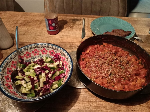 Half zes. Ik loop een ronde hard om het centrum. Lukt goed. Begin van de ochtend wandel ik naar de super. Koffie met De Vrouw. Meer koffie met De Vrouw. Lunch. Afwasje en huishoudelijks. Dan naar Gigant voor de repetitie van Wirwar. Erna fiets ik door naar Onze Vader om de was te wisselen. Krant. Eind van de middag maak ik avondeten: romanesco, knolselderij, courgette en rozijn uit de oven met een knolflooktahindressing. Een klein restant salade van gisteren vul ik aan met kaki. Voor De Vrouw bak ik runderschnitzel. We eten alles op. Natafelen. Afwasje. Lezen. Webstek. Lezen.