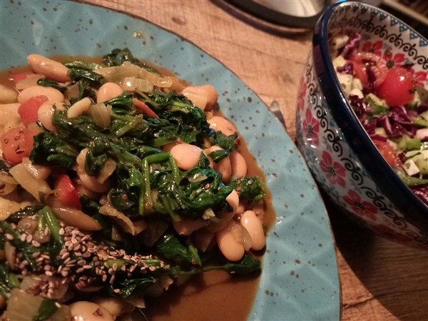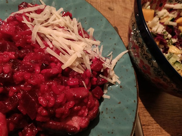 Zondag 1 februari: Kwart over zes. Ik loop een ronde hard langs kanaal en buiten het centrum, redelijk soepeltjes. Thuis nog terug in bed. Half tien staan we op. Koffie. We puzzelen wat op logeeraccomodaties in juni. Meer koffie met De Vrouw. De Zoon is er om half een voor lunch. Afwasje en stofzuigen. Ik wandel een rondje langs het kanaal. Vier uur is er de zondagmiddagluistersessie met de Duitsche vrienden (ik kies Yellow Magic Orchestra). Erna maak ik avondeten. De zondagrisotto is met shiitake, venkel en rode biet. Ernaast een salade van bosui, koolrabi, rode kool, komkommer en kaki. Voor De Vrouw bak ik steak bavette. We eten alles op. Natafelen. Afwas en afval. Webstek. Krant. Muziek vandaag: 50 Years Of Phaedra – At The Barbican (Tangerine Dream)