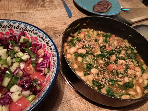 Zondag 18 januari: Half zeven. Ik loop een ronde hard langs het kanaal en buiten het centrum en het lukt goed. Thuis nog terug in bed. Pas om half tien staan we op. Koffie met De Vrouw. Nog wat puzzelen op de vakantiereis in juni. Meer koffie met De Vrouw. En nog wat meer puzzelen op de vakantiereis in juni. De Zoon is er om half een voor lunch. Afwasje en stofzuigen. Ik wandel een rondje langs het kanaal. Vier uur is er de zondagmiddagluistersessie met de Duitsche vrienden (MaidaVale). Erna maak ik avondeten. Eerst een salade van bosui, koolrabi, rode kool, komkommer en kaki. Vervolgens een risotto met ui, groene kool, zoete aardappel en feta. Ondertussen warm ik voor De Vrouw het restant groenekoolschotel van gisteren en eergisteren op. Ten slotte bak ik – ook voor De Vrouw – steak bavette. We eten alles op. Natafelen. Afwas en afval. Krant. Webstek. Lezen. Muziek vandaag: The Affirmative: The Yes Solo Family Album (allerlei), Rimfaxe (Gallarhorn)