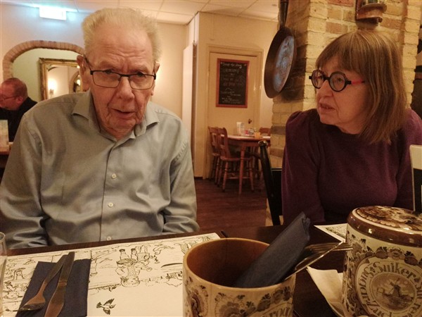 Vrijdag 13 februari: Onze Vader wordt 92 Onrustig geslapen. De wekker gaat op de gebruikelijke tijd. Ik loop een ronde hard langs Grift en kanaal. Niet gemakkelijk, maar het lukt goed. Zeven uur ben ik aan het werk. Koffie. Half elf rijd ik (op de elektrische fiets van De Vrouw) naar Onze Vader. Hij is nergens te bekennen, ook het personeel weet niet waar hij is. Op de gang kom ik hem tegen met de fysiotherapeute. Ik feliciteer hem van harte, maar hij lijkt niet te onthouden dat hij vandaag jarig is. We drinken koffie en hij vertelt dat hij bij de fysio een geheugentest heeft gedaan. Ik vraag wat hij moest doen, maar dat weet hij niet meer. Op zich is hij goed te spreken. We kletsen een tijdje, ik geef hem twee nieuwe pyjama’s en een boel nieuwe sokken en leg die in zijn kast. Dan rijd ik weer terug. Koffie met De Vrouw. Lunch. Afwasje. Ik breng mijn fiets naar een fietsenmaker en geef de opdracht uit te zoeken wat er gedaan moet wil ik er weer op kunnen rijden en of het de investering waard is. Wordt vervolgd. Aansluitend wandel ik een klein rondje buiten het centrum. Thuis weer aan het werk. Om half vijf heb ik het meeste afgewerkt en sluit ik af. Dik een uur later loop ik naar een pannenkoekenrestaurant. Daar tref ik De Vrouw en De Zoon, Onze Vader, Broers en Zus en aanhang. We eten wat en zowaar, Vader is redelijk helder en heeft af en toe zelfs wat aardigs in te brengen. Zo zie ik hem graag. Het duurt allemaal net niet te lang en om negen uur zijn we weer thuis. Krant. Webstek. Muziek vandaag: The Forest Sessions (Jonathan Hultén), Remixes (Yes & The Verge), de drie plaatjes uit de box The Word Is Live (Yes)