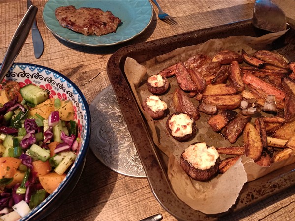 Zaterdag 7 februari: Half zeven. Koffie, ontbijt, allerlei voor Helemaal stuk. Begin van de ochtend loop ik de gebruikelijke zaterdagmorgenronde langs slager en super. Koffie. Even na half elf fiets ik naar Onze Vader. Ik tref hem aan op bed. Het duurt even voor hij in beweging komt en wat helderder is. Nog steeds zeer verward en grote geheugenproblemen. Ik wissel was en na een half uur rijd ik weer terug. Koffie met De Vrouw. De Zoon is er iets voor enen voor lunch. Afwasje en huishoudelijks. Gedrieën fietsen we naar De Neef, die vandaag zijn elfde verjaardag viert. Vol huis, veel lawaai, niet erg. Kwart voor vijf zijn we terug. Ik maak avondeten. Eerst leg ik knolselderij, bataat en aardappel in de oven. Later gaan daar met feta gevulde kastanjechampignons bij in. Ik vul een klein restant salade van gisteren aan met kaki. Voor De Vrouw bak ik steak bavette. We eten alles op. Natafelen. Afwasje. Webstek. Lezen en toneeltekst. Muziek vandaag: Spindle (Judy Dyble), het vierde en vijfde plaatje uit de box Yes: In A Word… (Yes)