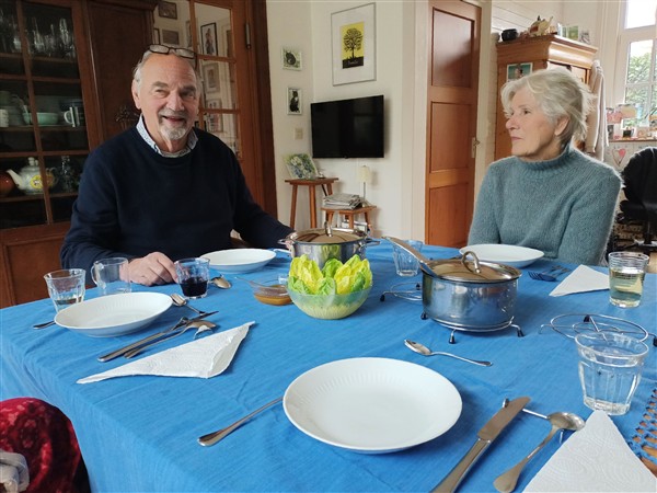 Woensdag 25 maart: Zes uur. Ik loop een ronde hard om het centrum en het lukt goed. Koffie en allerlei. Begin van de ochtend fiets ik naar een super. Thuis koffie. Dan rijd ik naar Onze Vader. Hij is wat verward, want is al een paar dagen zijn rollator kwijt. Gelukkig is er een leenexemplaar. Als hij wat rustiger is, hebben we het over de zorgwoningen die hij heeft bezocht en over het oude huis en wat hij mee zou kunnen en willen nemen. Hij is inmiddels aangemeld bij twee tehuizen en waarschijnlijk moet hij nog ergens tijdelijk gaan wonen tot er een definitieve woning vrij komt. Thuis lunch. Afwasje en huishoudelijks. Ik wandel een klein rondje langs het kanaal. Telefoon van Ank. We spreken af voor zaterdagmiddag. Lezen. Eind van de middag maak ik avondeten: een gele curry met ui, zoete aardappel, courgette, rode boon en veldsla. Ernaast een salade van bosui, rode rettich, rode kool, kerstomaat en mozarella. Voor De Vrouwe bak ik runderschnitzel. We eten alles op. Natafelen. Afwasje. Krant. Webstek. Lezen. Muziek vandaag: Young Americans (David Bowie), Resurrecting Dragons (unofficial) (Yes)