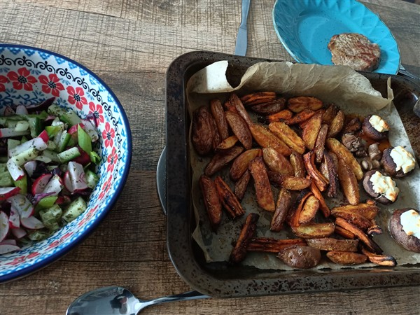 Zaterdag 28 maart: Zes uur. Allerlei. Begin van de ochtend loop ik de gebruikelijke zaterdagmorgen langs slager en super. Erna nog even naar de markt voor fruit. Koffie met De Vrouw. Vervolgens fiets ik naar Onze Vader. Hij is in goede doen; sinds kort heeft hij aanspraak met een meneer die bij hem op de kamer is gekomen en die ook oorspronkelijk uit Amsterdam komt en ook nog eens uit dezelfde buurt. Ik zie dat het hem goed doet; hij vertelt weer van alles. Als we na een tijdje met z’n tweeën zijn, merk ik dat hij vermoeid raakt; de verwarring slaat weer toe: hij vertelt hetzelfde verhaal drie keer achter elkaar, weet niet meer in welk huis hij woont en hoe het eruit ziet. Maar opgewekt blijft hij. Thuis meer koffie met De Vrouw. Dan lunch. Afwasje en huishoudelijks. Ik wandel een rondje langs het kanaal. Lezen en uitrusten. Eind van de middag maak ik avondeten. Ik leg aardappel, bataat en knolselderij in een braadslede in de oven. Ondertussen maak ik een salade van bosui, rode rettich, bleekselderij, rode kool en komkommer. Er gaan met feta gevulde kastanjechampignons bij de groenten in de oven. Voor De Vrouw bak ik steak bavette. We eten alles op. Afwasje. Lezen en toneeltekst. Webstek. Lezen en toneeltekst. Muziek vandaag: Live At Coventry Cathedral (Travis & Fripp), Follow (Travis & Fripp), Music Inspired By The Snow Goose (Camel), Tales From Yesterday (various)