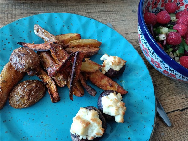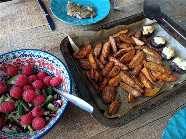 Zaterdag 25 april: Kwart over zes. Koffie, ontbijt, allerlei, waaronder voorbereidingen voor Helemaal stuk van 31 mei. Begin van de ochtend loop ik de gebruikelijke zaterdagmorgenronde langs slager en super. Koffie met De Vrouw. Dan nogmaals het centrum in. In de Syrische winkel koop ik brood en op de markt voor de deur mandarijnen. Vervolgens fiets ik naar Onze Vader. Hij is stram en stijf, loopt zeer moeizaam. Hij is ook wat verward en gespannen, maakt zich zorgen, er is dus mogelijk een woning maar hoe moet dat dan toch allemaal? Na enige tijd is hij meer ontspannen en rustiger en we kletsen over koninginnedag vroeger en koningsdag vandaag de dag. Thuis koffie op de galerij in de zon. Daarna lunch. Afwasje en huishoudelijks. Ik wandel een rondje door park. Uitrusten op de galerij in de zon. Krant. Eind van de middag maak ik avondeten: aardappel, bataat en met feta gevulde kastanjechampignon uit de oven met daarnaast een salade van bosui, koolrabi, rode kool, komkommer en framboos. Voor De Vrouw bak ik steak bavette. We eten alles op. Afwasje. Lezen. Webstek. Lezen. Muziek vandaag: het eerste plaatje uit Music For Quiet Moments (Robert Fripp), het vierde en vijfde plaatje (het tweede concert) uit Bongo Fury – 50th Anniversary Edition (Frank Zappa)