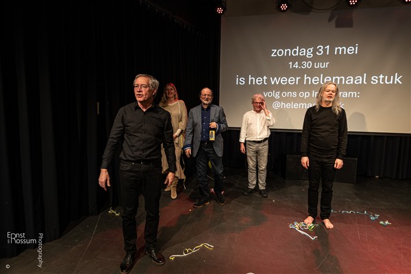 ‘Helemaal stuk, een voorstelling van zaken’: Aad van der Waal, Peter-Jan de Wilde en Bas Langereis presenteren een reeks theatervoorstellingen vol poëzie, muziek, verhalen en ongemakkelijke scènes, in zaal De Walvis in Gigant te Apeldoorn.